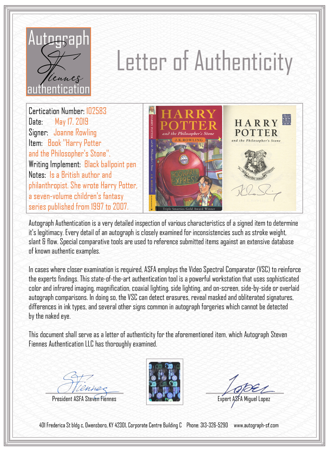 You will receive a Letter of Authenticity certifying that your autographed item is 100% authentic. The certificate has a hologram with a unique number that is assigned to each item that has passed the ASFA authentication. The same hologram with the same number will be on your item. This unique number is stored in our database and upon request, we are always available to confirm the authenticity of your item.